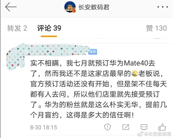 另外,Mate 40系列虽然尚未发布,但可能是因为它将是最后一款麒麟旗舰,意义非凡,已经不少铁杆花粉通过各种渠道抢先下单预订,并交了定金,着实令人感动。