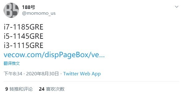 据知情博主爆料,有厂商发布了搭载特殊型号的11代酷睿迷你工控主机。处理器型号分别为:i7-1185GRE,i5-1145GRE 和 i3-1115GRE。英特尔也已确认将于北京时间9月3日0 点举办代号为Tiger Lake的下一代 10nm CPU系列正式发布活动。