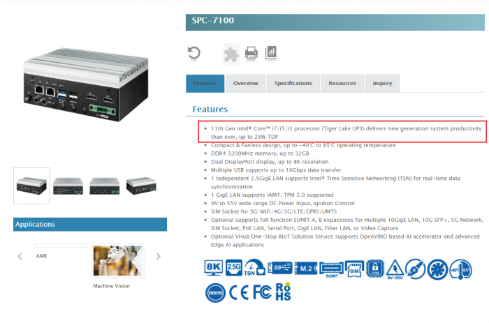 发布该迷你工控主机的公司名叫 Vecow ,产品信息由其官网公布,从型号来看,用于迷你主机的 GRE 11 代酷睿要比主流笔记本上的版本规格高一些。
