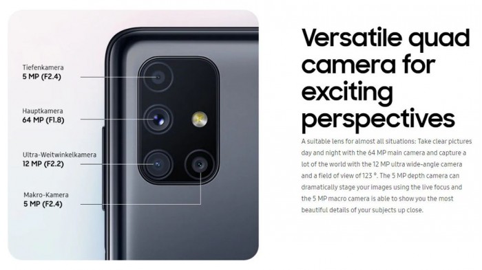 根据官方公布的细节,Galaxy M51 共有四个摄像头,主摄为 6400 万像素,此外配合 1200 万像素超广角镜头、500 万像素微距摄像头和 500 万深度传感器。此外机身正面装备了 3200 万像素自拍打孔摄像头。遗憾的是,宣传图片中只是提及了8核处理器,并没有明确说明具体型号。