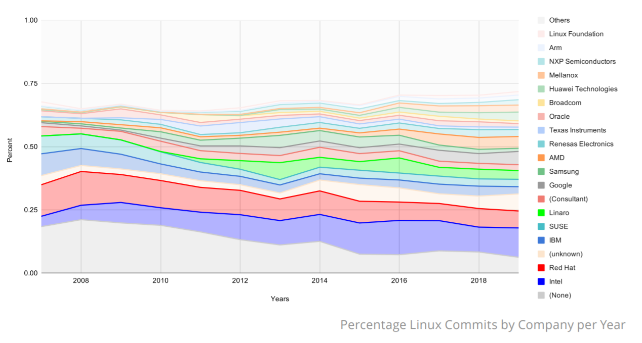 不少组织都在为 Linux 内核做贡献,贡献者排行榜前列几乎都被 Intel、Red Hat、IBM、SUSE、Google、Samsung、AMD、Oracle、华为和 ARM 这样的大企业占据。