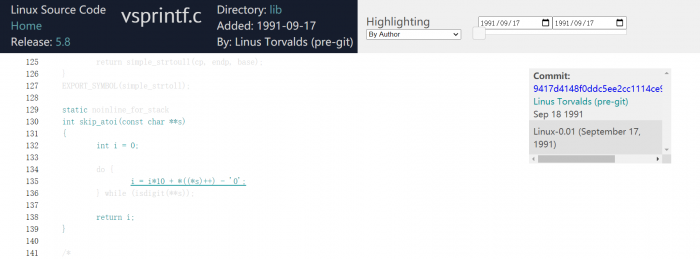 Linux 内核发布第一天起的某些代码仍在当前版本中使用,例如 Torvalds 和大学好友 Lars Wirzenius 共同编写的 vsprintf 例程,它也是为数不多存在至今的首次 commit 中的源代码。