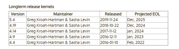 用户还想要受维护时间更长的版本,于是 2006 年发布的 2.6.16 版本成为第一个长期支持(LTS)版本内核。此后每年都有一个新的 LTS 内核,该内核将由内核社区维护至少 2 年(从 4.4 版本开始延长至 6 年)。Linux 内核官网公布了所有现存 LTS 版本的发行日期、EOL 日期及维护者(目前 6 个 LTS 版本都由 Greg Kroah-Hartman 和 Sasha Levin 这两人维护)。