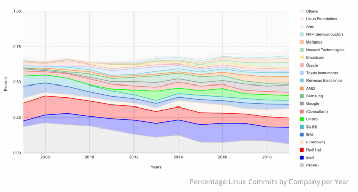 Linux 基金会指出,企业的贡献会根据业务需求和战略的不同而有所变化。前 20 名贡献者中,有些是 2007 年之后才加入,有些在此前做过很多贡献的公司,被收购后便不再继续参与。贡献者的多样性为内核发展赋予了一些弹性。