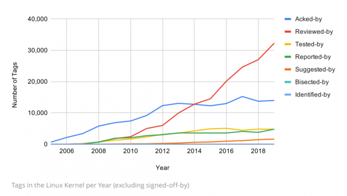 Signed-off-by 之外,Linux 内核还增加了表示审查的标签(Reviewed-by 和 Acked-by)。审查对内核代码的质量来说相当重要,标签的加入令这个过程更加清晰,有越来越多的维护者选择使用标签来表示已审查。