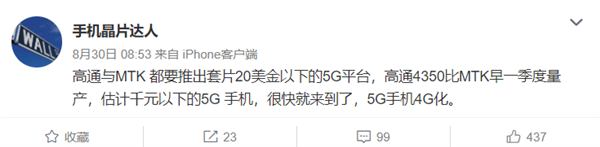 据业内人士@手机晶片达人 爆料,高通和MTK(联发科)都要推出套片20美金以下的5G平台,高通4350比MTK早一季度量产,估计千元以下的5G 手机,很快就来到了,5G手机4G化。