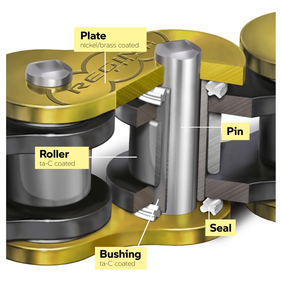 内外链板之间还有一个橡胶X型密封圈,大概是为了防止路面砂石的进入,但由于M耐力链不需要粘性润滑油,所以那些路面砂石几乎不会粘附在链条上。