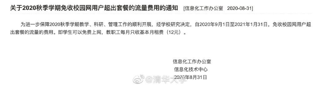 各大中小、高等院校纷纷迎来开学季,日前,清华大学的一则通知引发网友热议。通知题为《关于2020秋季学期免收校园网超出套餐的流量费用的通知》,发布单位为信息化工作办公室。