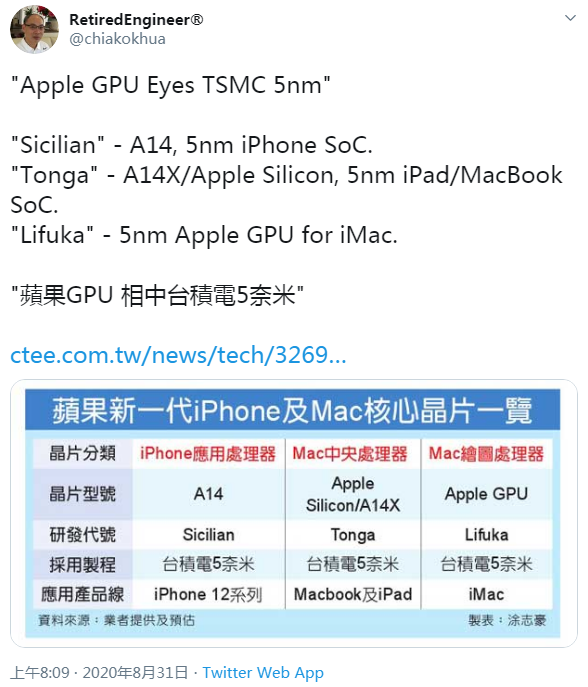 @chiakokhua 在 Twitter 上援引中国台湾地区《工商时报》的报道称,iPhone 上使用的 A14 SoC 代号为“Sicilian”,采用的是台积电 5nm 工艺。