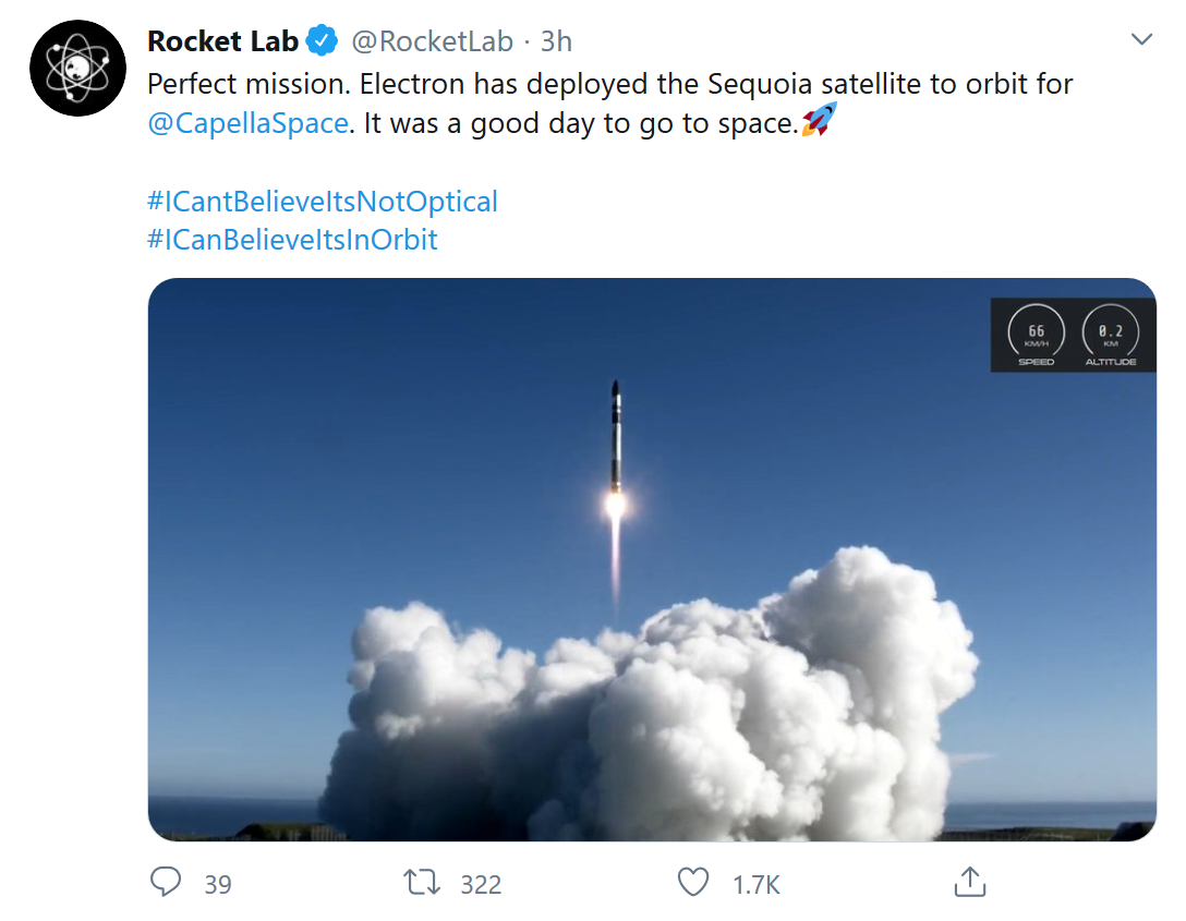 如果这个团队对今天为信息服务公司Capella Space发射100公斤的Sequoia卫星还有些紧张的话,他们很快就平静下来了。在这个第14次发射中,其公司的电子助推器成功ong发射台离开、进行了一级分离并将有效载荷部署到轨道上,这被认为是一项完美的任务。