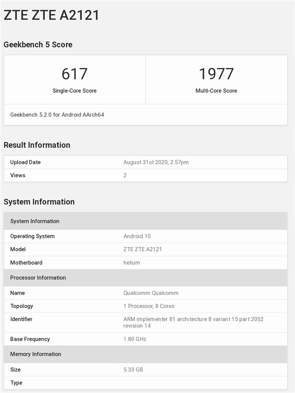 首款屏下摄像头手机中兴AXON 20 5G将于明天正式发布,现在关于这款新机的大部分悬念已经揭晓。8月31日消息,中兴AXON 20 5G现身GeekBench跑分网站。GeekBench页面显示,中兴AXON 20 5G搭载高通骁龙765G中档处理器,配备6GB内存,单核跑分617分,多核成绩为1977,运行Android 10。