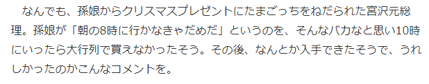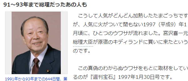 ·原来是当时宫泽喜一的孙女天天缠着宫泽让他给买电子宠物鸡,并告知“早上8点去排队才能赶上!”,因为日本商场一般10点开门,宫泽不以为然10点去买发现长长的队伍根本没买到,之后还是不知动用什么办法才买到了这炙手可热的万代电子宠物鸡。