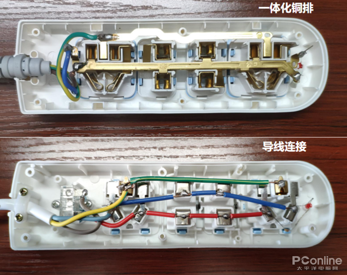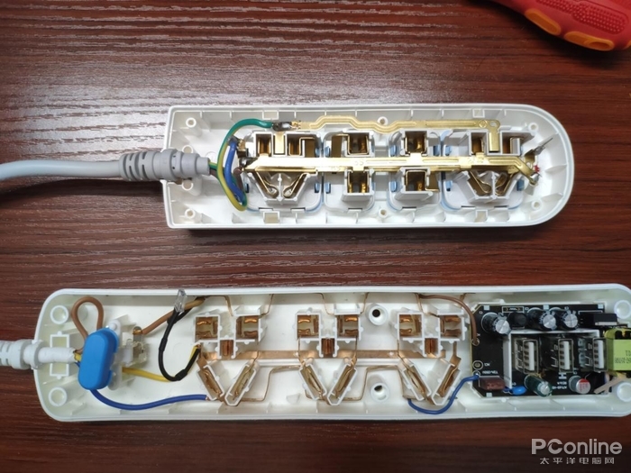 接下来我们才开外壳继续往下看。可以看到,这两款排插采用的都是一体铜排的设计,从颜色上看,两者采用的应该都是磷青铜。