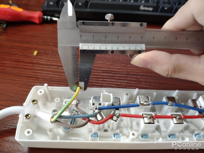 至于电源线的线径,我再用游标卡尺量了一下,果不其然,线径连1mm都不到。