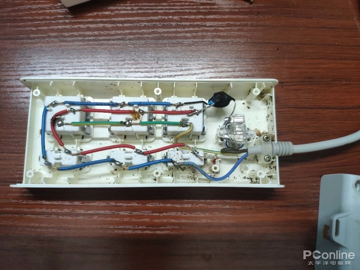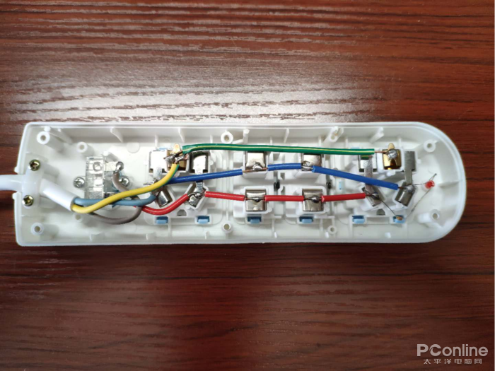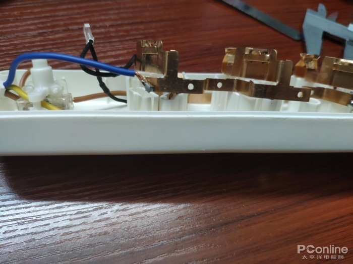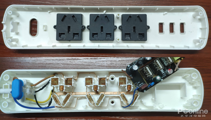 一个排插打开可以分为三个部分,分别是电源线、塑料外壳以及铜排,当然有些排插会带有开关、USB供电的电路板还有防浪涌模块,不过这些不是必要的东西,这里我们就先不讲。