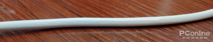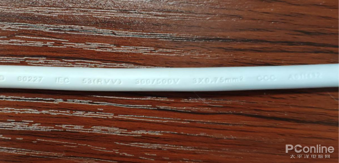 先看电源线,可以看到电源线的印字很浅很模糊,有些地方都快看不见了。不过还是可以看到上面的3C认证标志,电缆外层材质PVC,生产厂家还有额定电压,但是居然没有标明线径。