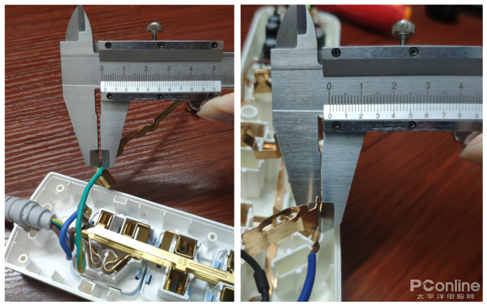 铜排是一个排插最核心的地方,市面上常见的铜材质一般有磷青铜、紫铜和黄铜,其中紫铜含铜高接近纯铜,但太软,适合做导线;黄铜太硬且含铜量太低(55%-65%),容易出现接触不到的情况,不合适用在插座上;而磷青铜含铜量85%上下、耐磨且抗疲劳性强,适合多次插拔,所以做适合用在排插上。从颜色上看,三种材质很容易区分,黄铜金黄色、磷青铜褐色、紫铜带一点紫红色。