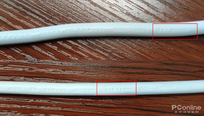 其中,3个C的标志代表的就是我国的3C认证,每一条合格的电源线都有这个认证标志。而60227 IEC 53(RVV)指的其实就是电源线的型号,RVV电线另一个名称就是铜芯聚氯乙烯绝缘聚氯乙烯护套软电线,这种电线的耐温一般为70度。300V/500V指的是电源线的额定电压,其中的300V指的是每芯电缆对地的额定电压,而500V指每芯电缆间的额定电压。至于,电线上“3*0.75mm2”指就是电线的芯数和线径。