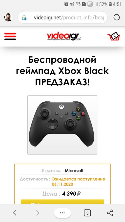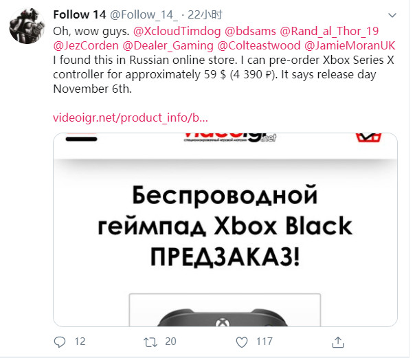 目前一家俄罗斯电商Videoigr上架了Xbox Series X手柄并开启了预售,发售日为11月6日,可能印证了之前XSX将于11月第一周发售的传言。如上图,Twitter网友Follow_14_表示通过这家电商,自己能预购XSX的手柄,售价大约是59美元,和当前的无线Xbox One手柄价格一致,发售日为11月6日。