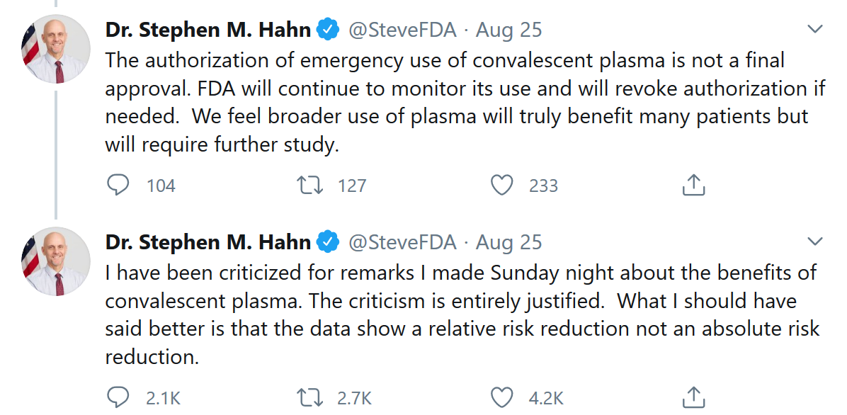 Hahn向《金融时报》解释了他做出这一决定的原因。几天前,Hahn因支持血浆疗法而受到了大量批评。