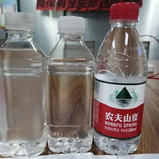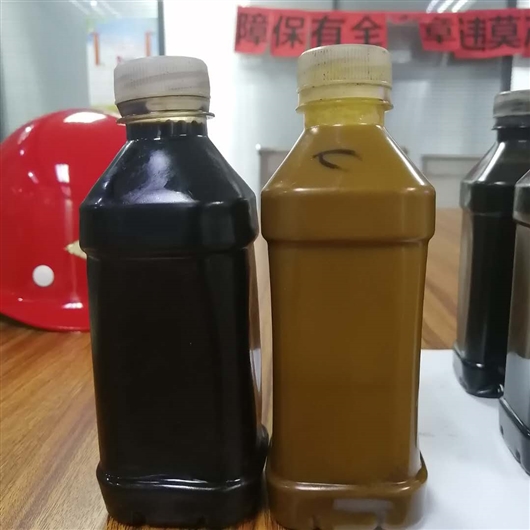 1号生物质溶剂油,2号二代生物柴油;右侧为比色用的矿泉水