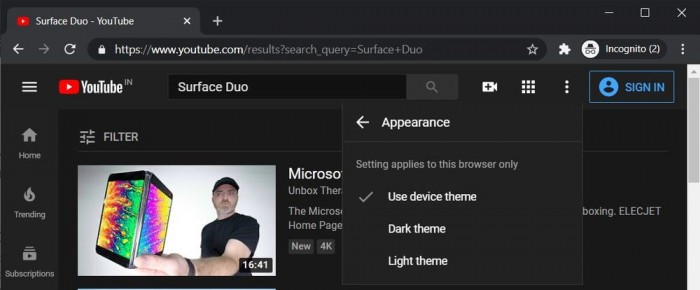 这里新增了名为“使用设备主题”的新选项,允许 YouTube 网页应用自动更新其配色方案,从而跟随 Windows 10 系统的设置进行自动调整。