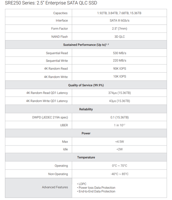 寿命方面,群联QLC硬盘支持0.1DWPD,也就是每天全盘覆写0.1次,与15.36B的寿命结合起来,依然是写不死的级别。