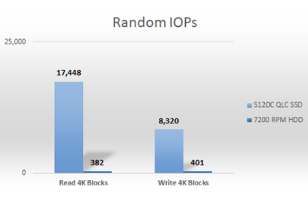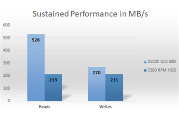 这个QLC硬盘的性能在SSD中不够看,不过它的定位是取代HDD硬盘,所以在速度上依然胜出,随机性能依然是HDD硬盘的20倍到50倍之间,功耗也比16TB硬盘低了38%。