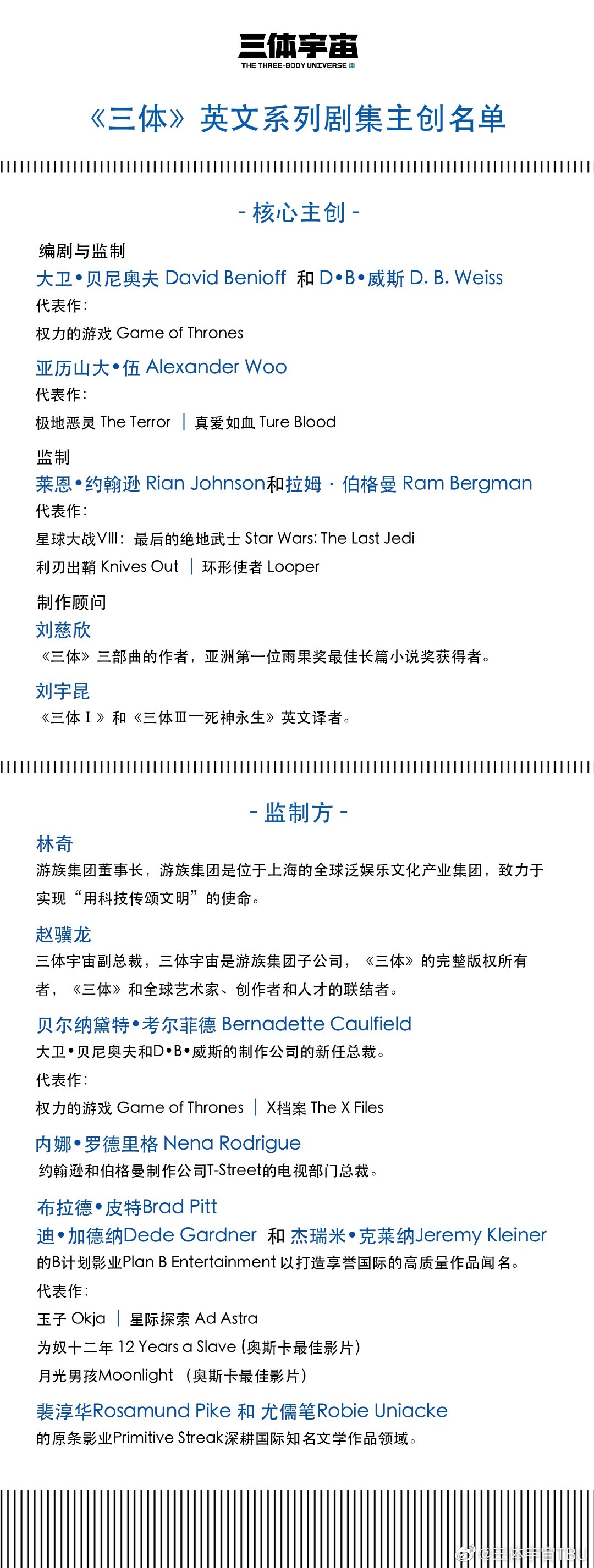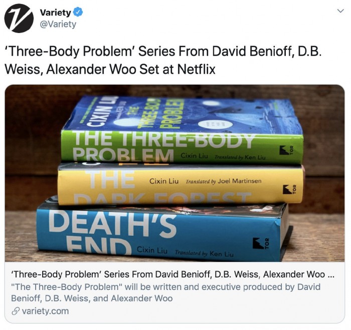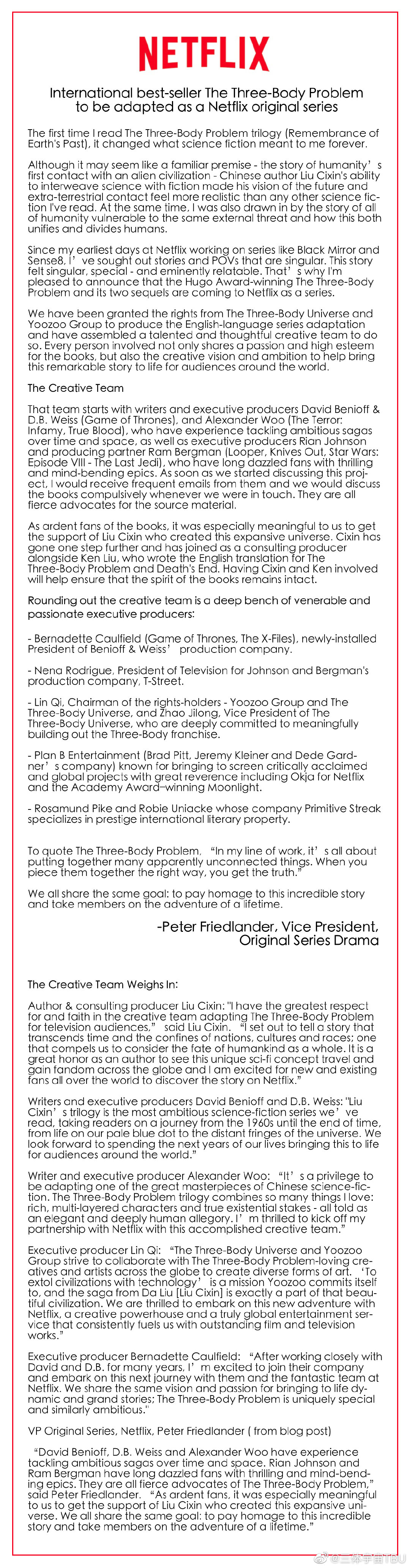 据多家外媒报道:Netflix将把《三体》三部曲小说拍成剧集,将由三体宇宙、游族集团与全球最大付费流媒体平台奈飞(Netflix)联合开发制作。原著作者刘慈欣@workership 与英文译者刘宇昆将共同担任制作顾问。