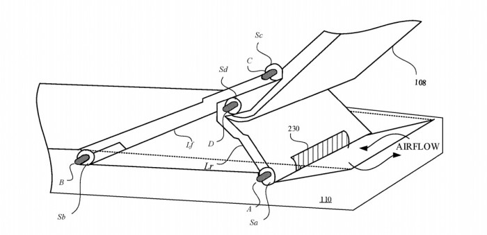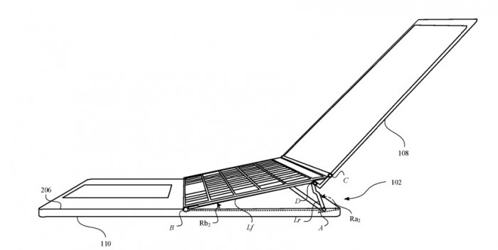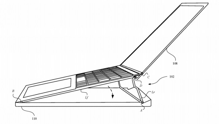 在周二授予苹果的一项名为 "用于便携式电子设备的联动组件 "的专利中,苹果概述了一些可以让MacBook对用户更加符合人体工程学的方法,而不需要外部辅助工具。简而言之,苹果认为用户可以从将MacBook的后半部分抬高,以创造一个更加舒适的打字姿势。