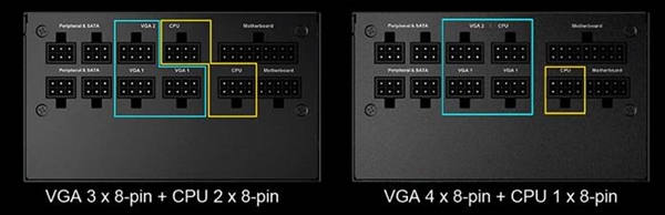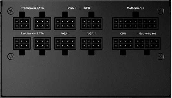 为满足硬件高需求,MPG GF系列采用全模组设计,拥有支持多达3 x 8pin的显卡供电接口和2 x 8pin的CPU供电接口,支持VGA 4 x8pin和CPU 1 x 8pin的安装。如下图所示。