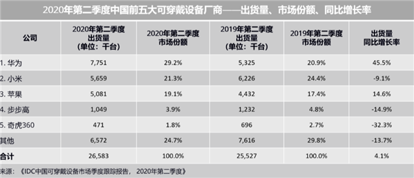 其中,华为2020年第二季度可穿戴设备出货量775.1万台,相较2019年第二季度的532.5万台,同比增长45.5%。