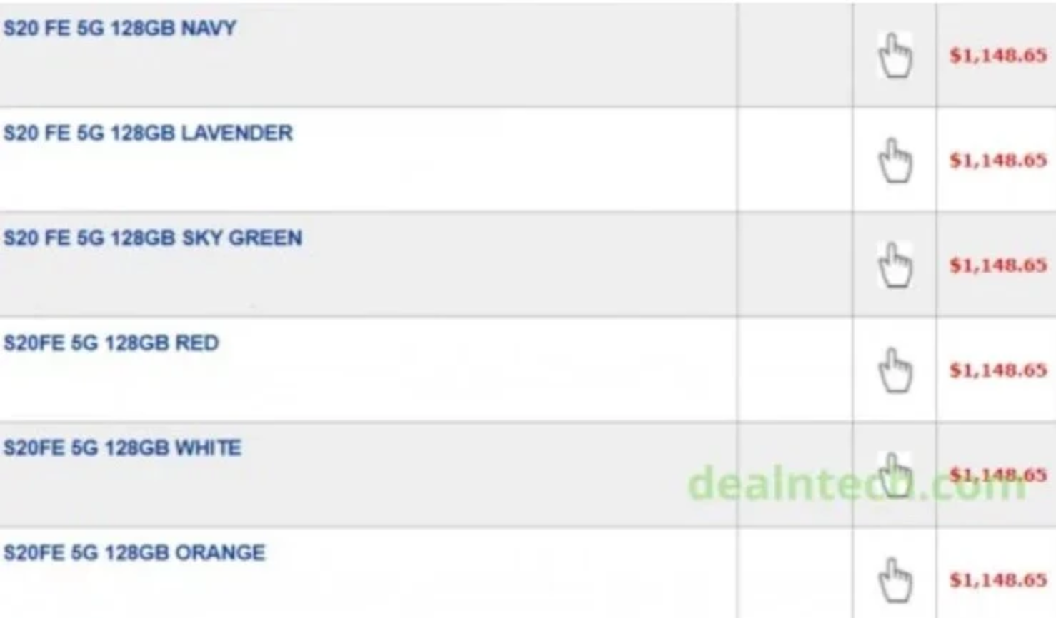 据泄露的图片显示,S20 FE(128GB)的5G版本在加拿大的售价约为1148.65加元(折合人民币约为6021元),相当于878美元。泄露的图片还显示,这款智能手机将有六种不同的颜色可供选择,分别是深蓝色、淡紫色、青绿色、红色、白色和橙色。