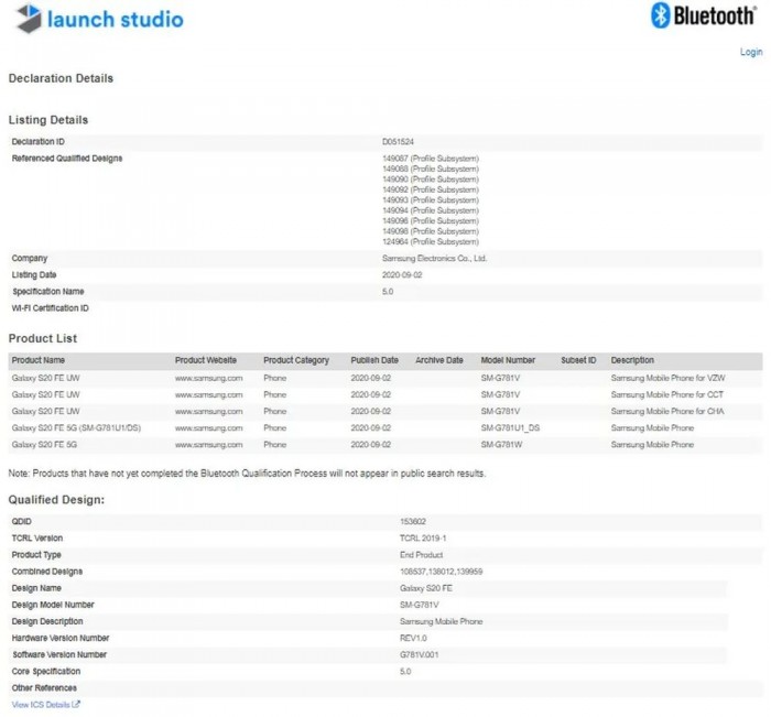 目前共有 SM-G781V、SM-G781U1_DS 和 SM-G781W 三个型号通过蓝牙 SIG 网站认证,不同的后缀可能代表着不同的运营商。这款手机将会根据市场的不同,推出 4G 或者 5G 版本。除了名称和型号外,蓝牙SIG认证只告诉我们,即将推出的设备将支持蓝牙5.0。