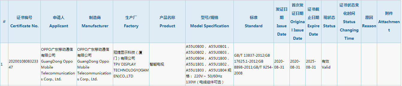 手机品牌入局电视行业已经不是新鲜事,华为、小米、一加等品牌都已入局,现在电视行业即将迎来新玩家——OPPO。早在OPPO Find X2系列发布之时,沈义人就预告OPPO智能电视将在今年下半年亮相,现在它来了。9月2日消息,OPPO智能电视获得3C认证,屏幕尺寸为55英寸,生产厂为冠捷显示科技(厦门)有限公司。