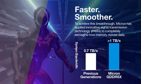 伴随着NVIDIA RTX 30系列显卡的发布,美光也正式推出了新一代GDDR6X显存,号称“世界上最快的显存”。HBM当然更快,但都是与GPU整合封装,而且贵得多。