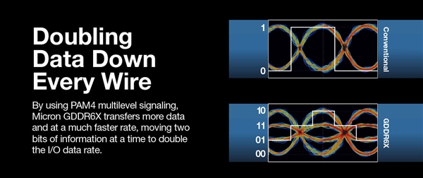 GDDR6X自然就是GDDR6的升级版,一如GDDR5X、GDDR5的关系,基本架构和技术保持不变,重点加入了PAM4信令机制,在处理器和内存之间,使用四档电压,每个周期内编码和传输两个比特位。