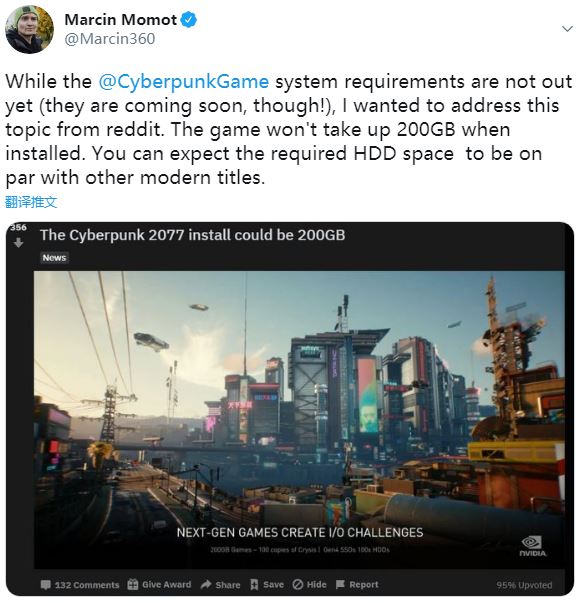 “关于《赛博朋克2077》的具体系统配置需求还没有确认(但它们很快就会公开的),我想先澄清一下Reddit上的这个话题。在游戏安装完毕之后,《2077》的体量不会达到200GB那么大,它所需的硬盘空间和其他现代游戏差不多。”