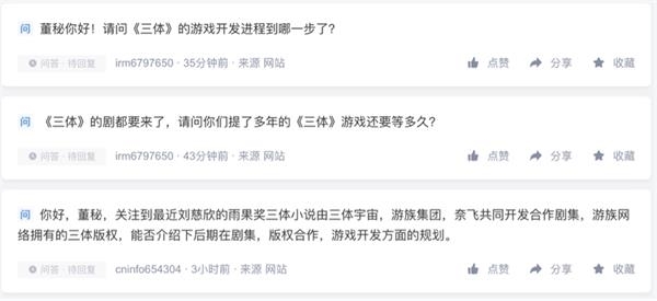 游族多次提及,“开始筹备国内顶级科幻IP《三体》的多款游戏”, “在引进IP方面,已经吸纳储备经典IP《三体》”。
