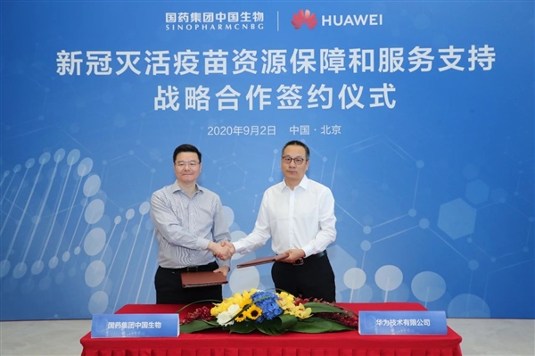9月2日,国药集团中国生物、华为技术有限公司在北京签署新冠灭活疫苗资源保障和服务支持战略合作协议,双方将合作抗击新冠疫情、保障员工健康,同时在疾病预防、生物技术应用创新等方面展开跨界合作。