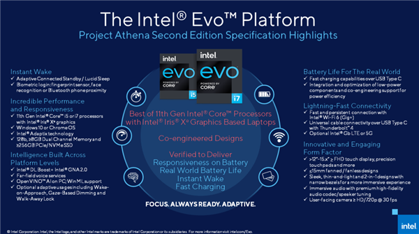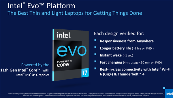 在EVO平台中,支持11代酷睿处理器是没跑的,设计要紧凑,还要通过25+项性能及反应时间测试,支持雷电4、Wi-Fi 6+网络,充电30分钟可以用4小时,FHD下续航时间不低于9小时。