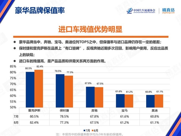 虽然国内对于豪华品牌追求较多,但包括保时捷、BBA在内,其进口车的保值率与雷克萨斯相比,还存在不小的差距。保值率最高的保时捷,其三年保值率在77.3%左右。