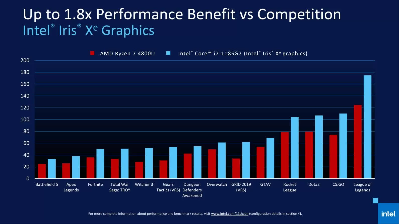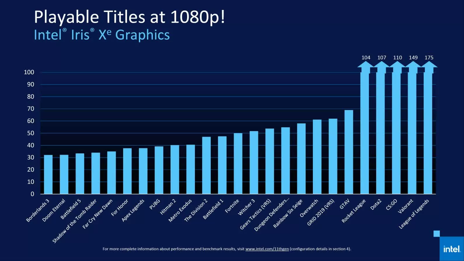 首次在英特尔集成显卡上运行《无主之地 3》、《孤岛惊魂:新曙光》、《杀手2》和其他主流1080p游戏,相比上代产品游戏时性能提高多至2倍。英特尔称,性能超越该细分市场中90%的独立显卡。