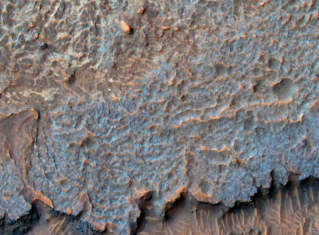 MRO的HiRise相机对该区域进行了仔细观察。亚利桑那大学HiRise团队在8月30日的图片日专题中写道:“在这张图片中,我们可以看到很多细节,但地表纹理的来源还是很有趣的”。