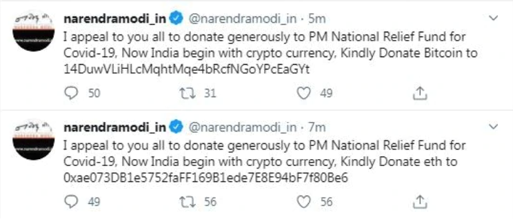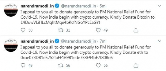 北京时间9月3日消息,印度总理莫迪个人网站的Twitter账号在周四稍早时候遭到入侵。莫迪个人网站账号narendramodi_in发布了一系列推文,要求其粉丝通过加密货币的形式向一个救济基金进行捐赠。这些推文随后被撤下。
