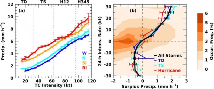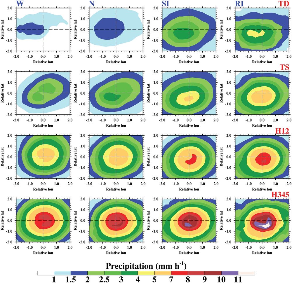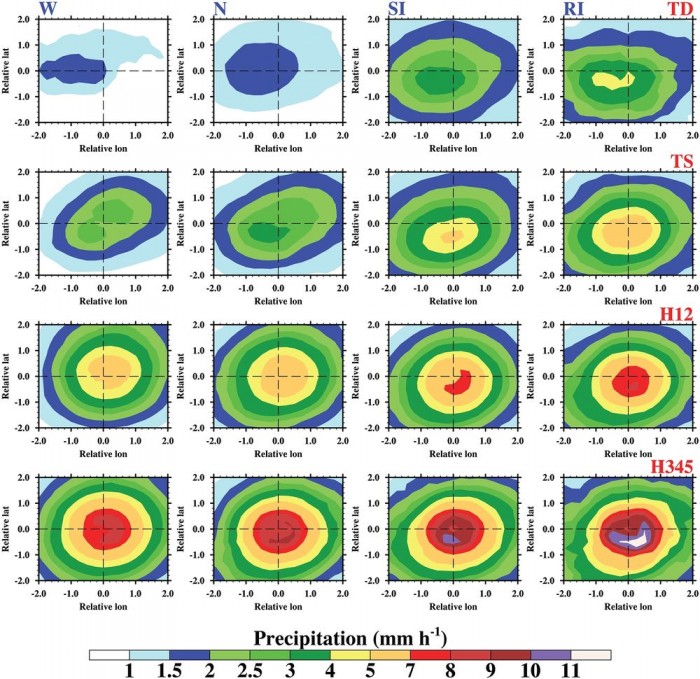 研究人员已经确定,风暴核心附近的降雨量激增是一个很好的指标,表明风暴正在进一步增强。除此之外,风暴的强度可以部分地通过飓风强烈云层中存在的水冰数量来判断。风力越强,水被带到高处变成冰的几率就越大。
