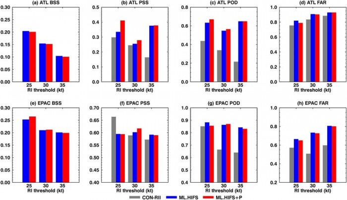 而且这些关键参数都可以被宇航局的卫星发现,通过将这些卫星数据和人工智能算法整合起来就能更好的预测风暴。在测试他们预测风暴强度变化的新框架时,研究人员发现,它比预测快速增强(简称RI)的标准方法准确度高40%到200%,而假阳性率只高出4%到7%。这无疑是一个非常明显的改进,风险的负面影响非常小。