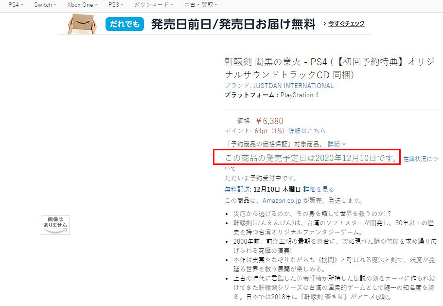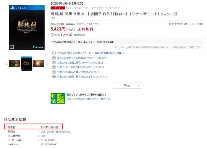 据多家日本地区网上商城(亚马逊、Neowing、乐天等)显示的消息,《轩辕剑7》PS4日版的发售时间为12月10日,PS4日版售价为6380日元(约合人民币410.8元),初回预约特典为原声CD。