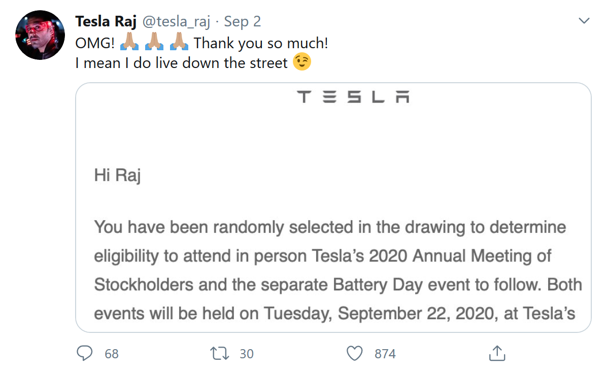 9月3日消息,据国外媒体报道,电动汽车制造商特斯拉已开始向部分投资者发送邀请函,邀请他们参加该公司的2020年年度股东大会和“电池日”活动。据悉,本周二,关于这两场活动的邀请函图片开始在网上流传。图片显示,特斯拉将于当地时间2020年9月22日(星期二)在加利福利亚州弗里蒙特Page Ave.901的特斯拉工厂举办这两场活动。