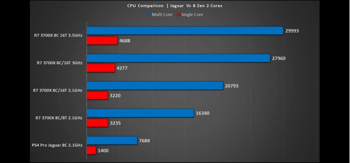 测试中把与PS5的AMD Zen 2架构CPU相似的CPU放入了对比(也就是不同频率的R7 3700X),测试数据图表显示,PS4的得分与在PS5中提供的Zen 2内核等效版本进行比较,PS4的CPU性能与次世代主机PS5将使用的CPU性能有很大差异,PS5的CPU性能为PS4的4倍。